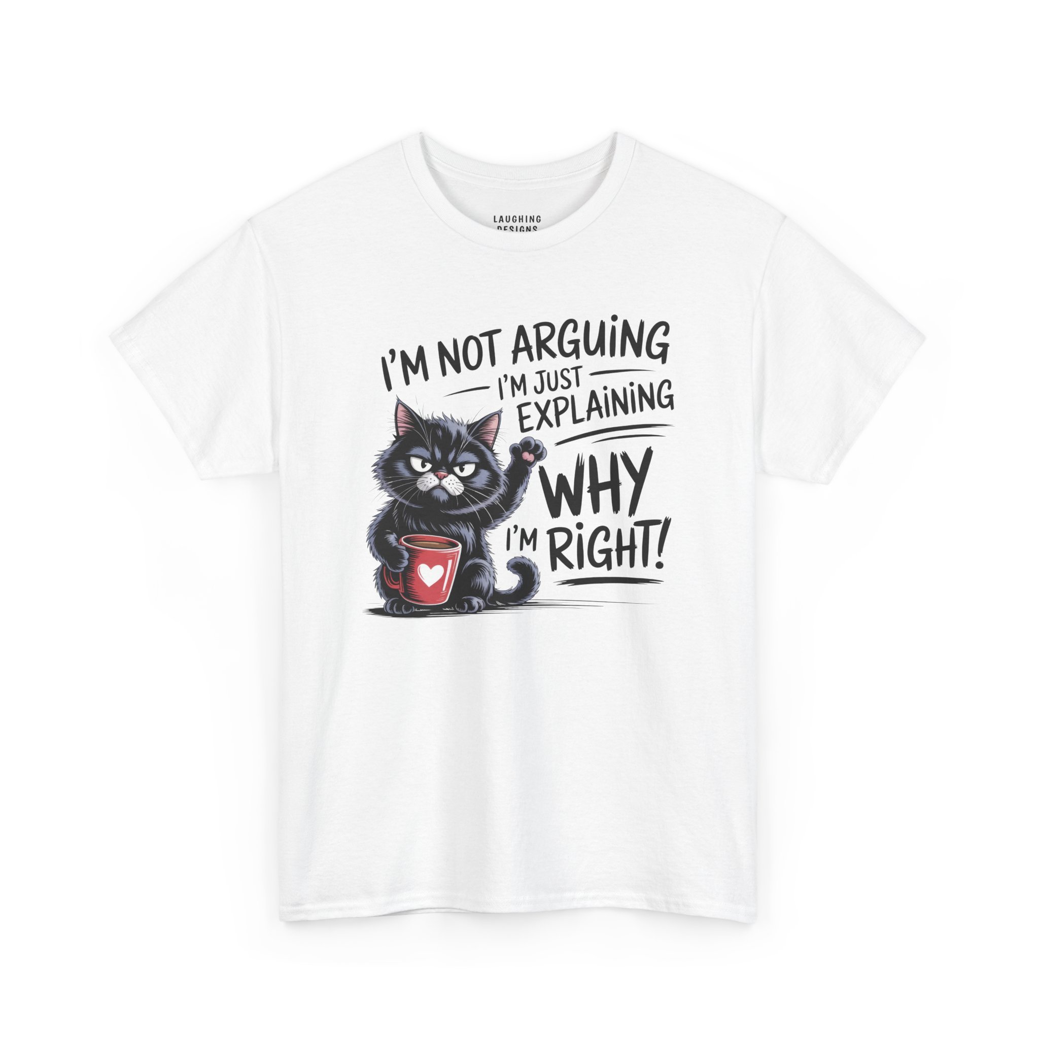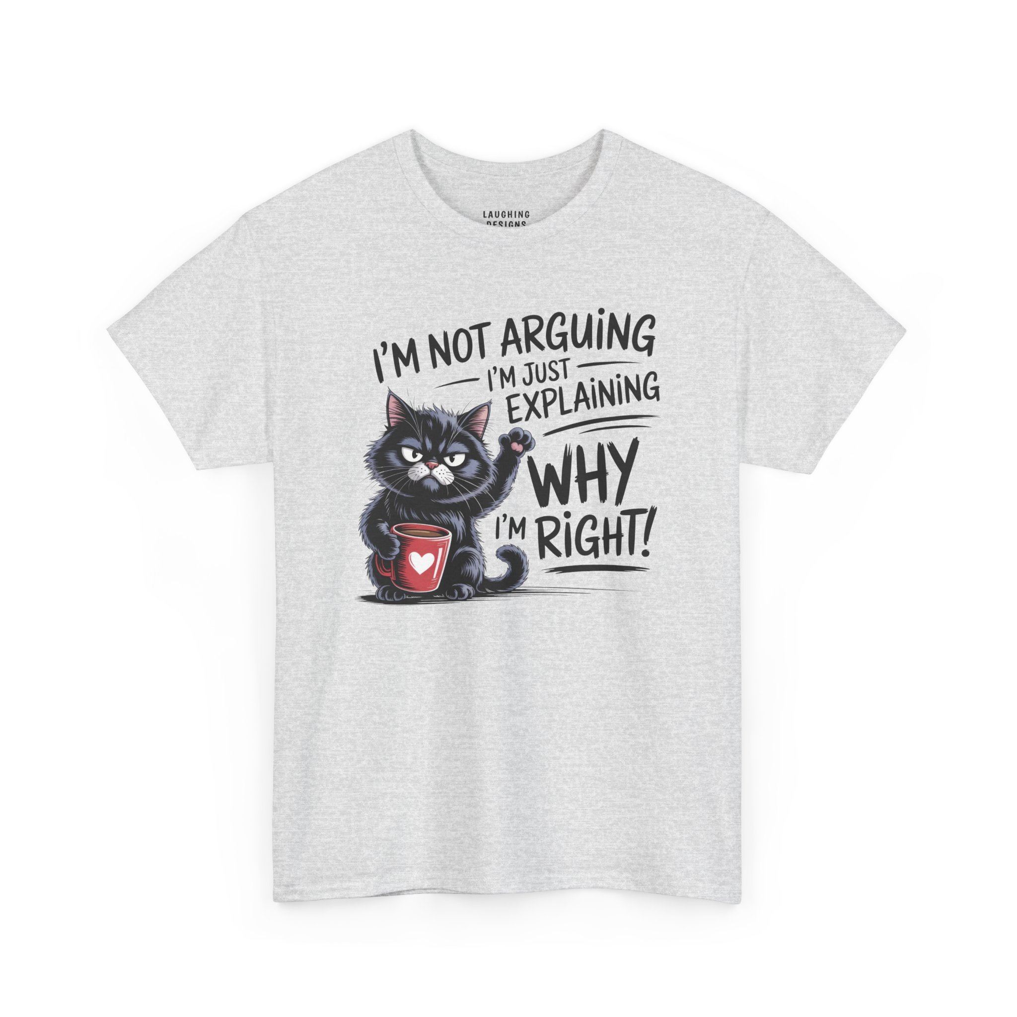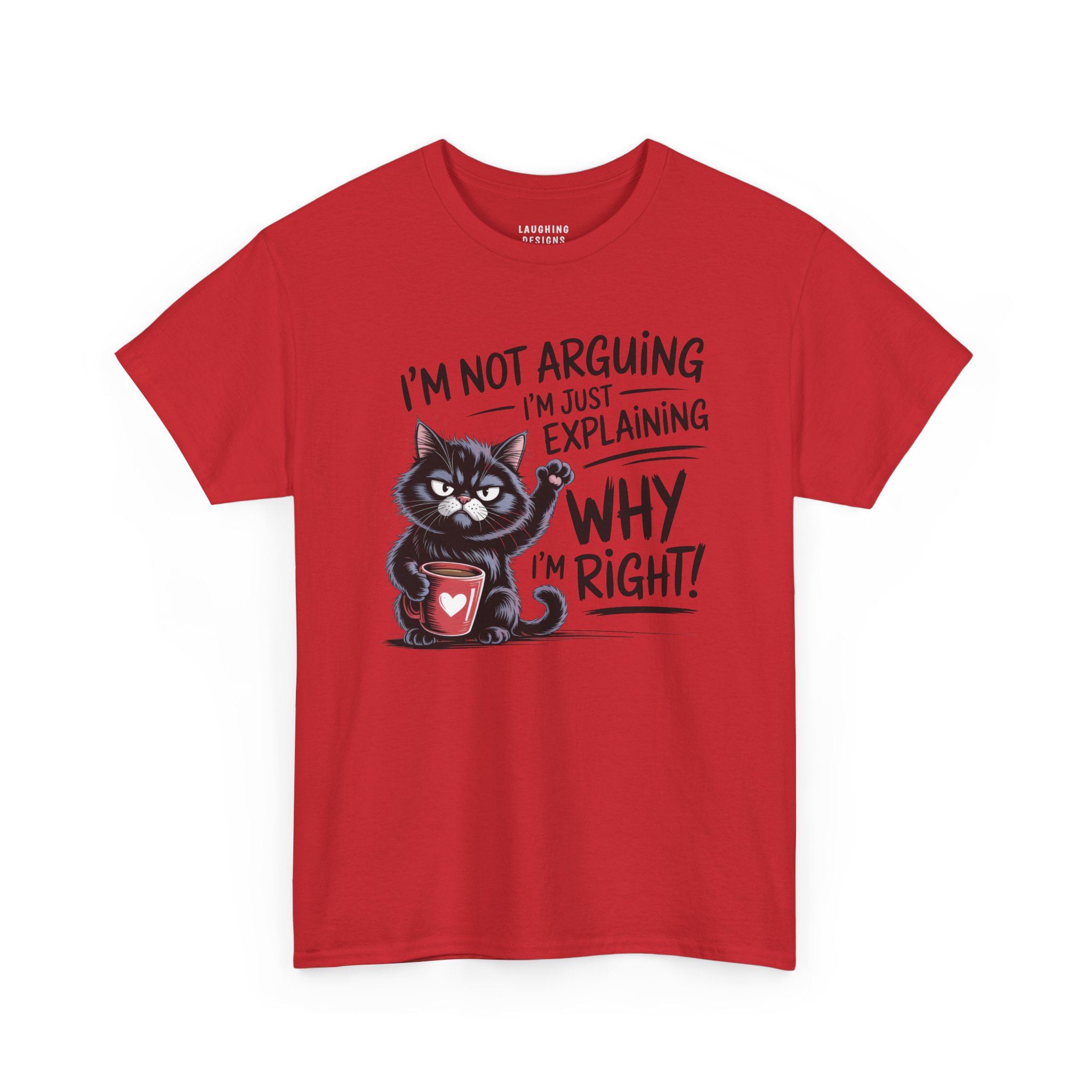 The design features a determined black cat clutching a red coffee mug, raising a paw to emphasize the point. With the text “I’m Not Arguing, I’m Just Explaining Why I’m Right,” this tee serves as a fair warning to anyone thinking about challenging your expertise (especially before you’ve finished your coffee).