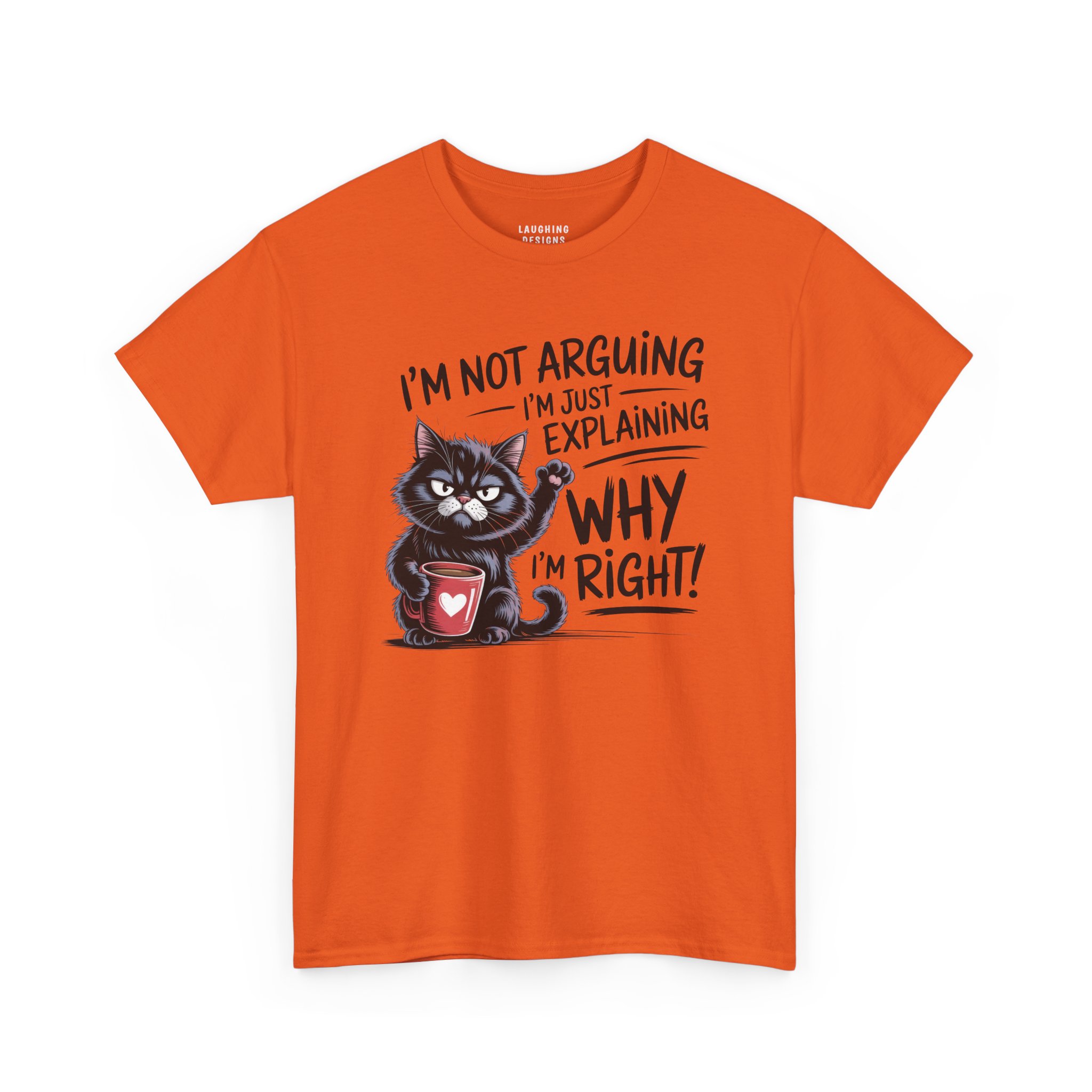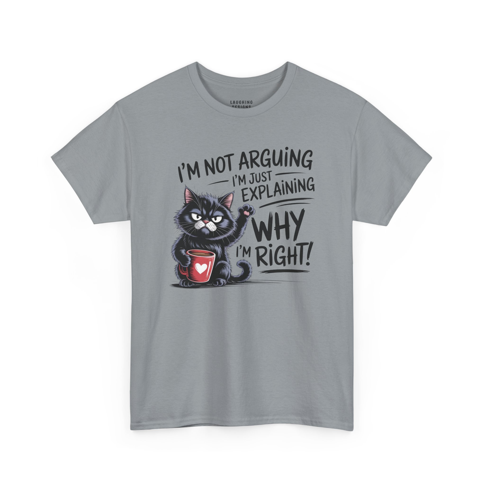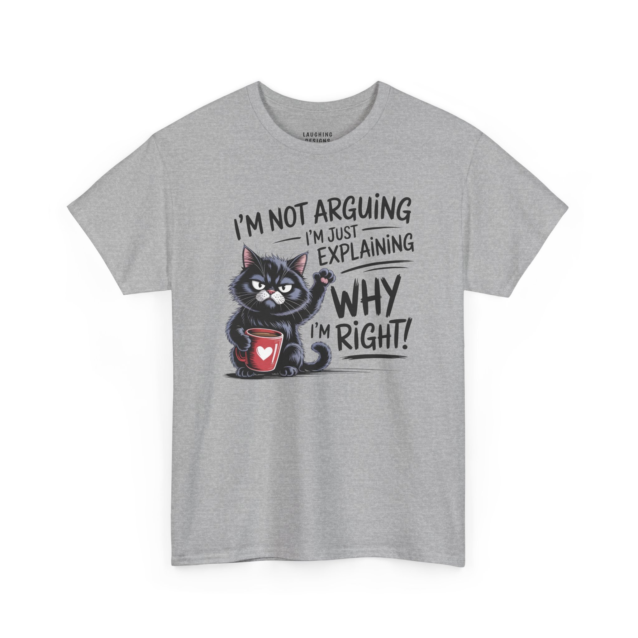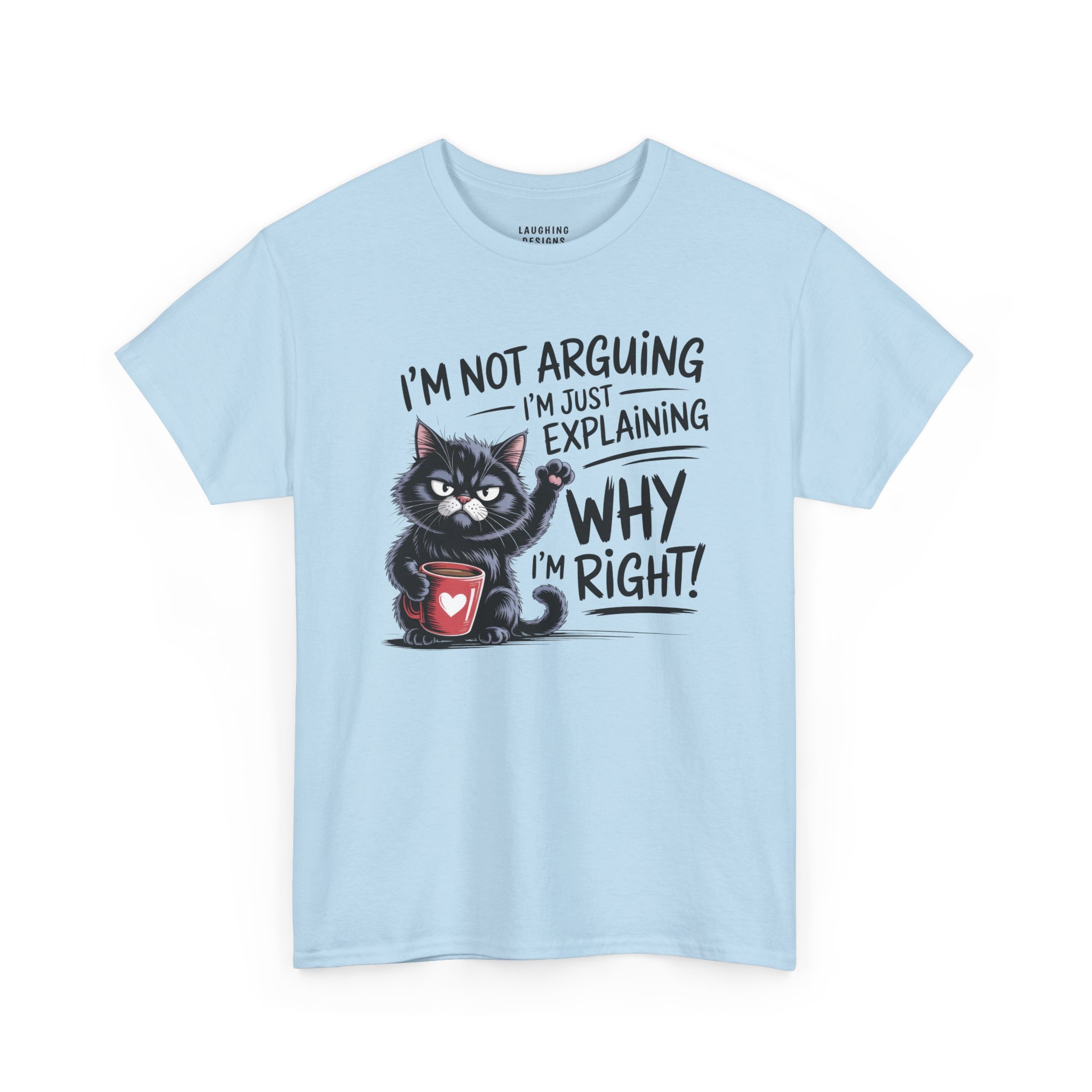 The design features a determined black cat clutching a red coffee mug, raising a paw to emphasize the point. With the text “I’m Not Arguing, I’m Just Explaining Why I’m Right,” this tee serves as a fair warning to anyone thinking about challenging your expertise (especially before you’ve finished your coffee).
