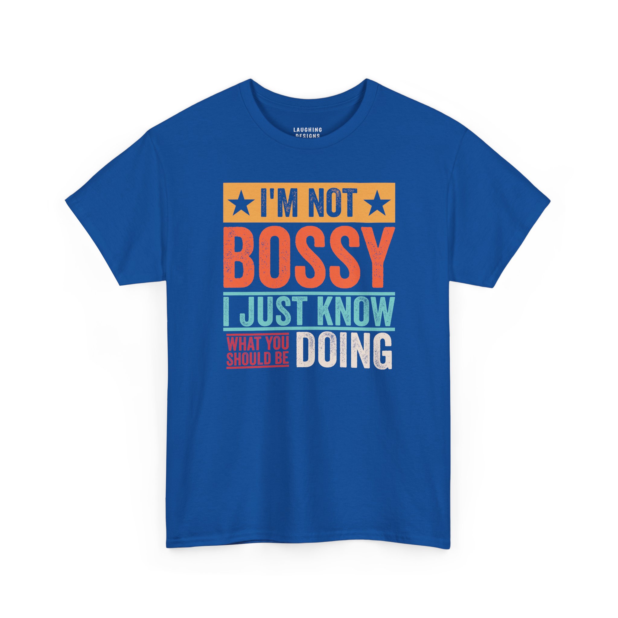 The design features bold retro typography in vintage orange, teal, and red colors with a distressed texture. The text “I’m Not Bossy, I Just Know What You Should Be Doing” serves as a helpful public service announcement. Wear it to family gatherings, team meetings, or anywhere else people need a little extra guidance.