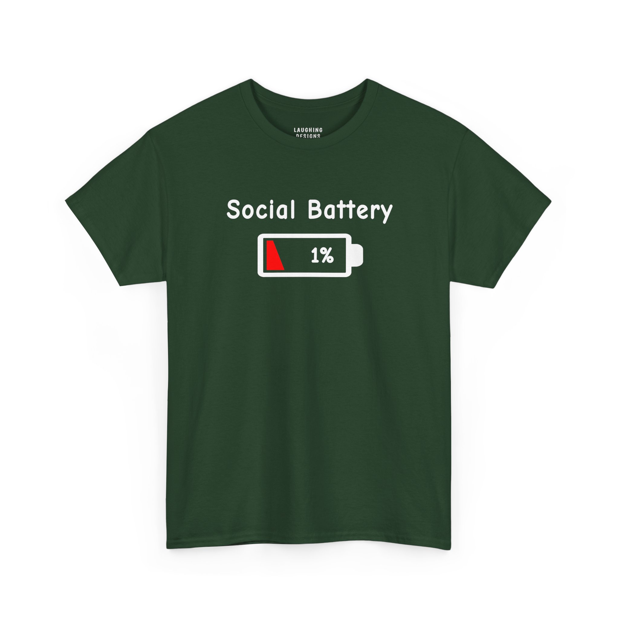 The design features a classic digital battery icon draining to red with the text “Social Battery 1%”. It serves as a hilarious visual cue to friends and family that you are currently operating in “Power Saving Mode” and further interaction may cause a system crash.